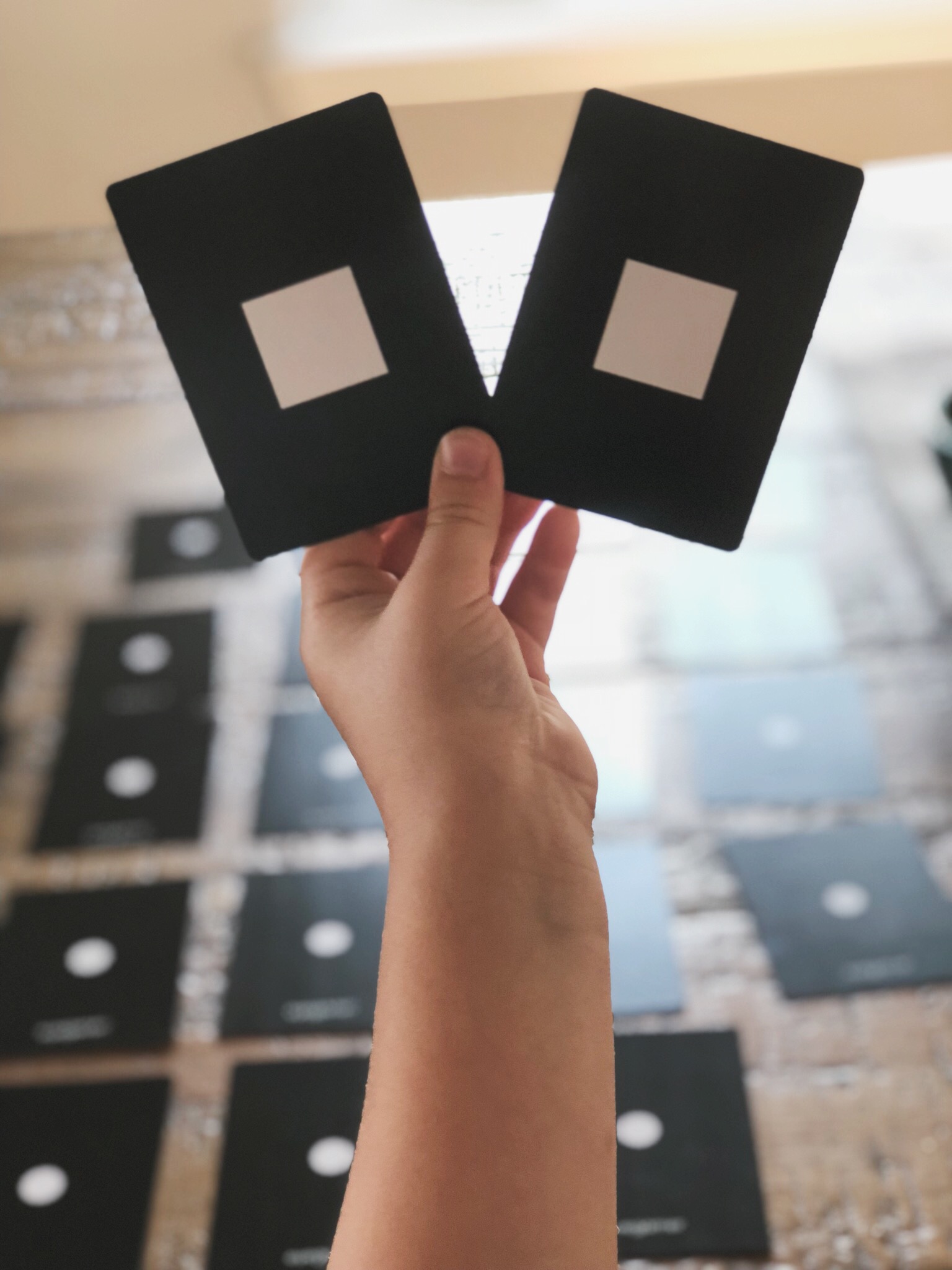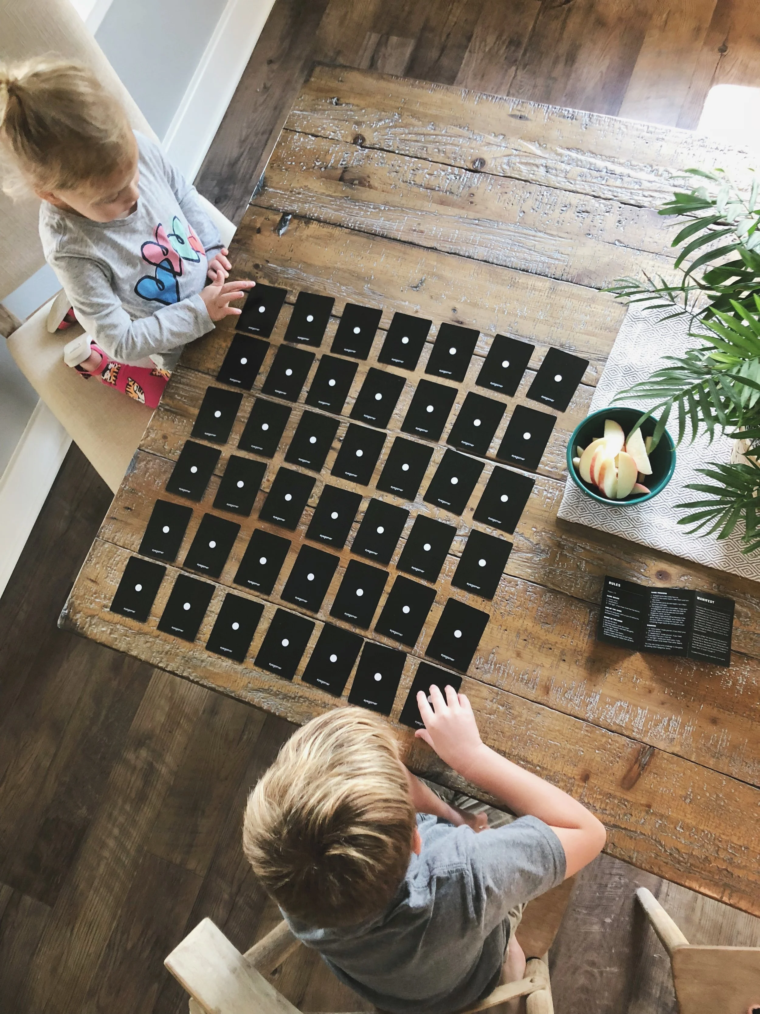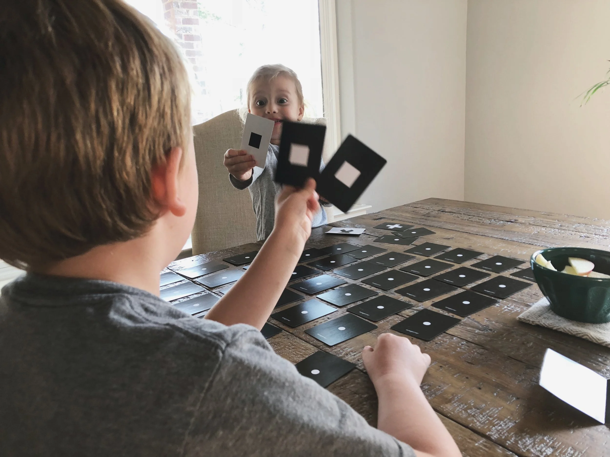 As a mom of littles, itβs important to me that I find ways for my kids to spend time together without a screen in front of them. I was thrilled when Eyegamer asked if we would be interested in trying out their game set! Not only does the card game βtrain your perception, memory and visual thinking,β itβs also aesthetically pleasingβa definitely plus for me! While Ruby (3) is a bit young to play by the rules, she enjoys turning the cards over and naming the shapes while Remi (7) loves finding matches! The kids have fun without realizing that they are improving their working memory. Now thereβs no excuse when they βforgetβ to clean their rooms!!