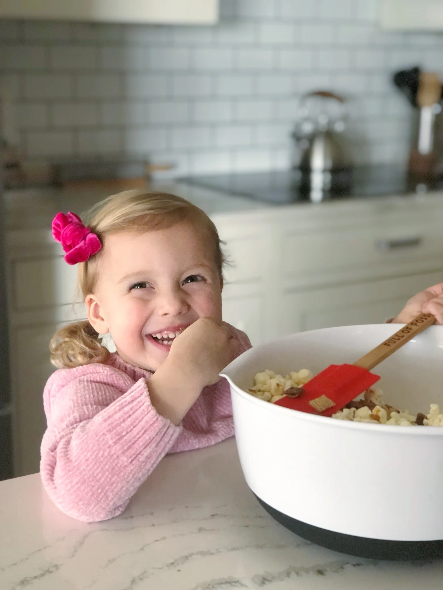 My daughter, Ruby, loves to spend time in the kitchen with me. This week we made Gluten Free Snickerdoodle Chex Mix using ingredients from the package The Chex Cereal Team sent us over the holidays. The ingredient list is simple: Cinnamon Chex, Chocolate Chex, popped popcorn, butter, cinnamon, and sugar. When kids are in the kitchen, the simpler the better! This recipe was easy enough that my 3.5 year old could sprinkle, pour and mix the ingredients to her heartβs content (with a little bit of help from Mom.) I think the taste testing was her favorite part!